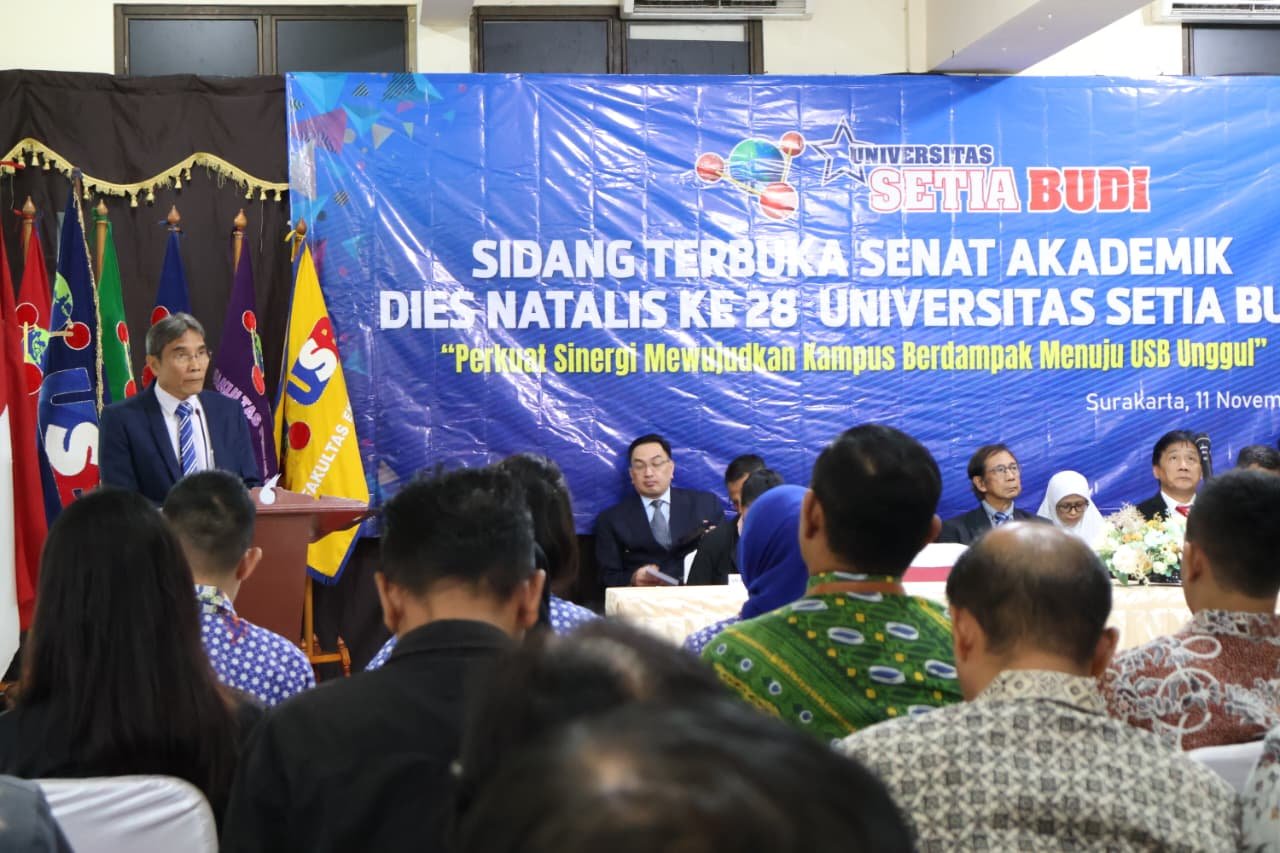 Universitas Setia Budi (USB) berupaya untuk terus berkembang menjadi perguruan tinggi unggul, tidak hanya dalam pendidikan dan penelitian, tetapi juga dalam kontribusi nyata bagi masyarakat dan bangsa. Hal tersebut yang mendasari tema Dies Natalis ke-28 USB “Perkuat sinergi mewujudkan kampus berdampak menuju USB Unggul”. Hal itu dikemukakan Wakil Rektor III USB, Dr. apt. Titik Sunarni, S.Si., M.Si., dalam laporannya pada acara Dies Natalis ke-28 USB yang digelar pada Selasa (11/11/2025) di kampus Universitas Setia Budi Surakarta. “Rangkaian kegiatan dies natalis ke-28 ini dilaksanakan dari tanggal 1 November – 30 Desember 2025 yang dibagi dalam 5 kategori kegiatan utama, yaitu Bidang Kegiatan Ilmiah, Olahraga, Seni, Sosial dan Seremonial,” ungkapnya.